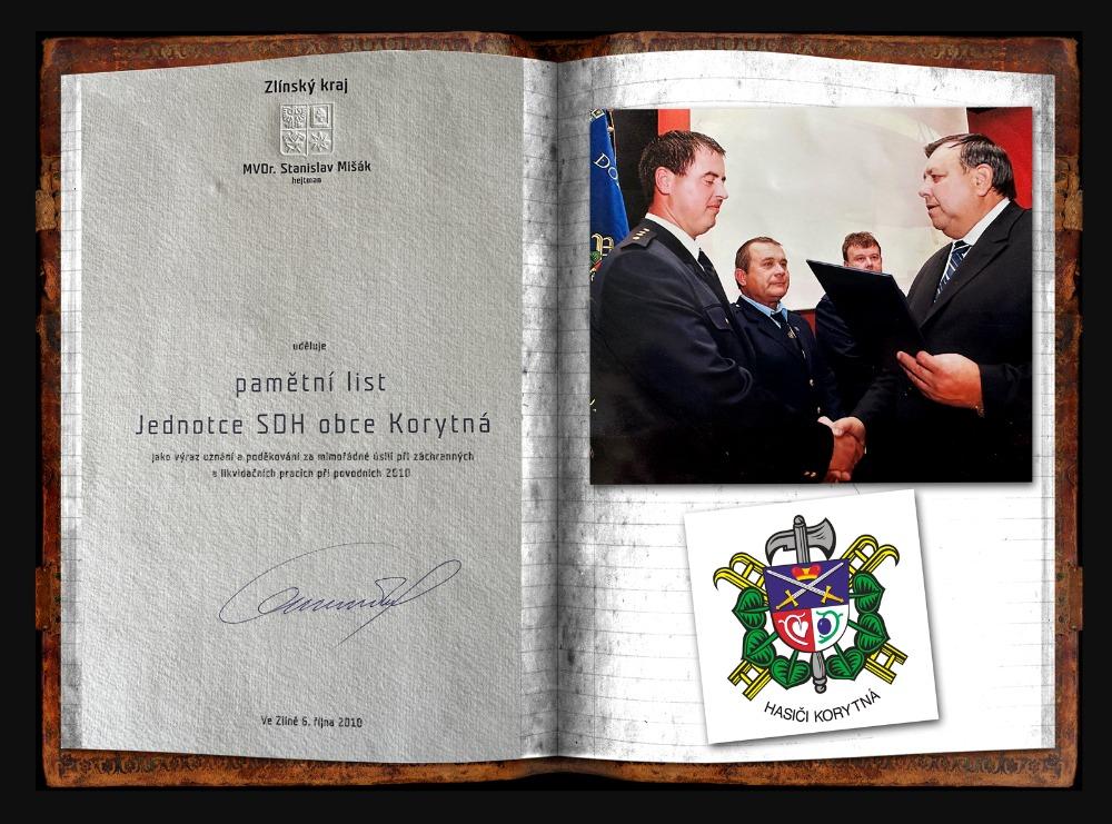 pamětní list pro SDH Korytná